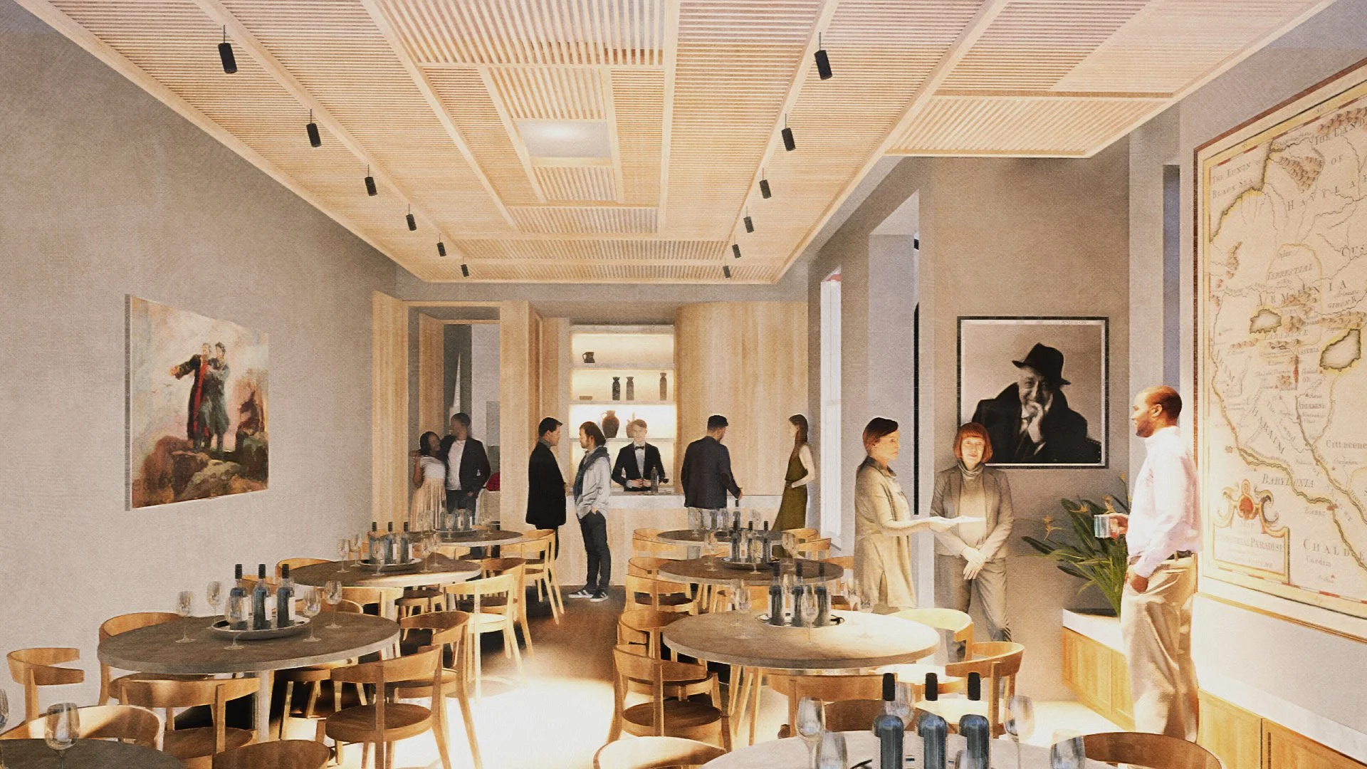 The main event space supports larger gatherings while maintaining intimacy and comfort. Environmental performance is integral to the design. Fresh air supply and return systems integrate above a new ceiling structure, allowing the space to function well without visual clutter. The ceiling geometry takes quiet inspiration from traditional hazarashen roof constructions found in Armenia—not as decorative reference, but as a way of resolving structure, light, and volume. The form negotiates the double-sided geometry of the room, with a bar feature and bay windows at either end, while discreetly accommodating ventilation units at the lower points of the ceiling.